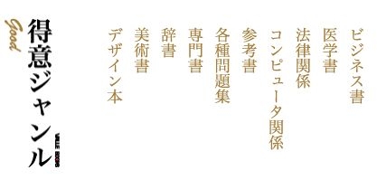 | デザイン書 美術書 辞書 専門書 各種問題集 参考書 コンピューター関係 法律関係 医学書 ビジネス書 |